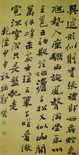 清康熙年间的板桥,坐对纸窗竹影,铺开笔墨画起了他最爱的竹子。“秋风昨夜窗前过”,他看见清风在竹叶间穿行,看见竹子摇曳的样子。板桥画竹有“胸无成竹”的理论,他画竹并无师承,多得于纸窗粉壁日光月影,直接取法自然。针对苏东坡“胸有成竹”的说法,板桥强调的是胸中“莫知其然而然”的竹,要“胸中无竹”。这两个理论看似矛盾,实质却相通,同时强调构思与熟练技巧的高度结合,但板桥的方法要“如雷霆霹雳,草木怒生”。 板桥这幅《竹石图》,竹子画得艰瘦挺拔,节节屹立而上,直冲云天,他的叶子,每一张叶子都有着不同的表情,墨色水灵,浓淡有致,逼真地表现竹的质感。在构图上,板桥将竹、石的位置关系和题诗文字处理得十分协调。竹的纤细清飒的美更衬托了石的另一番风情。这种丛生植物成为板桥理想的幻影。板桥的竹子,连“扬州八怪”之首金农都感叹说,相较两人的画品,自己画的竹子终不如板桥有林下风度啊。